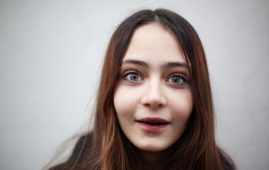 Close-up portrait of a little schoolgirl.girl 11,12,13 years old holds a folder for papers on a gray background. copy space