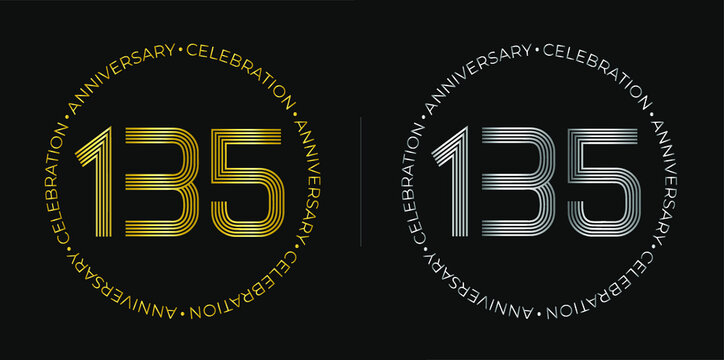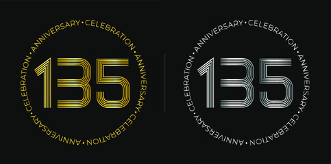 135th birthday. One hundred and thirty-five years anniversary celebration banner in golden and silver colors. Circular logo with original numbers design in elegant lines.