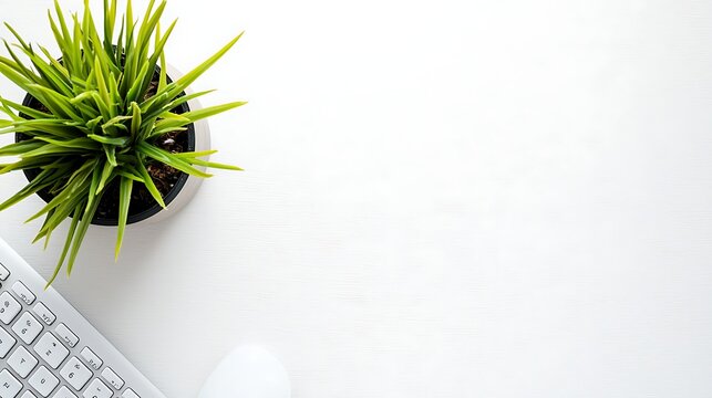 137. Minimalist workspace setup with wireless keyboard, mouse, and potted plant on clean desk