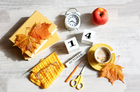 Calendar for October 14 : the name of the month in English, cubes with the number 14, books, an alarm clock, maple leaves, a knitted scarf, a cup of coffee, eyeglasses on a gray background