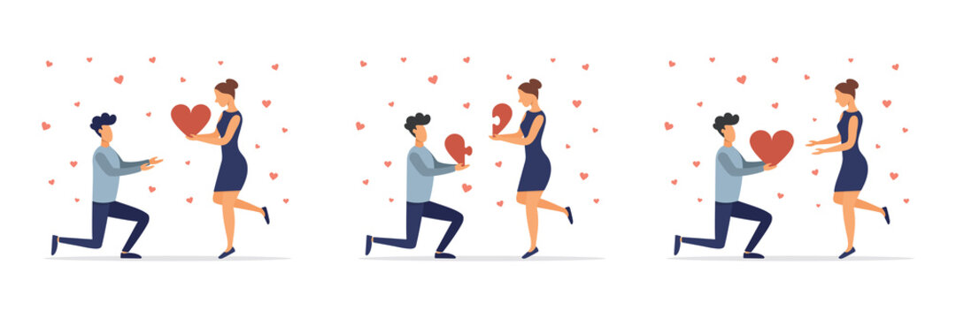 Valentine's day concept. A loving couple celebrates Valentine's Day together on February 14. People hold hands and give each other hearts. Set of vector illustrations.