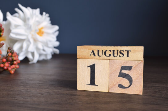 August 15, Date cover design with calendar cube and white Paeonia flower on wooden table and blue background.