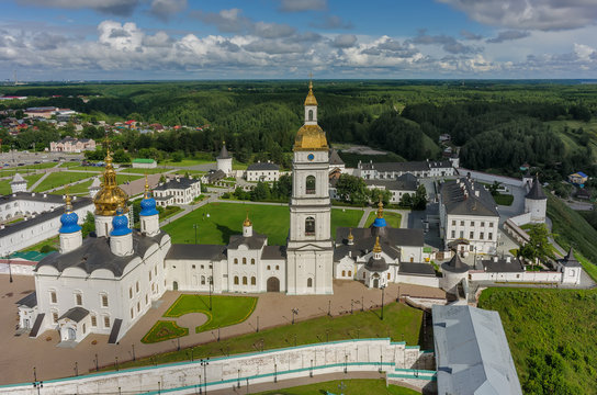 Tobolsk, Russia - July 15, 2016: Aerial view onto Tobolsk Kremlin with St. Sophia-Assumption Cathedral and belltower in summer day. Tyumen region