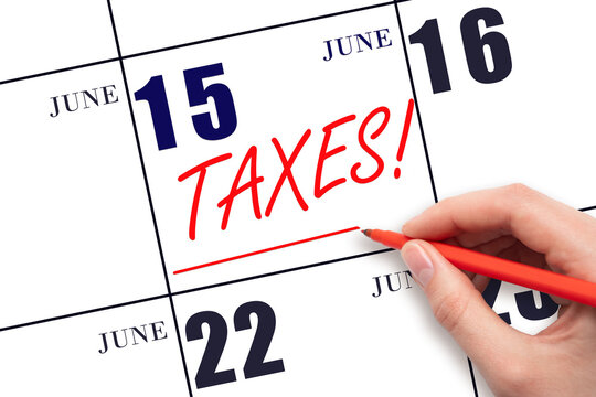 Hand drawing red line and writing the text Taxes on calendar date June 15. Remind date of tax payment