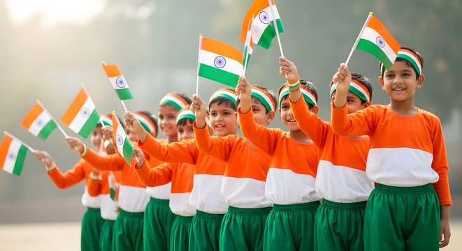 Cheerful School Children Waving Indian Flags – Celebrating Independence with Joy