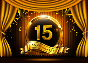 15th Anniversary celebration background. 3D Golden numbers with bent ribbon, confetti and balloons.