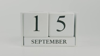 A hand flips a wooden calendar from September 15th to September 16th on a white background, signaling the change to a new day