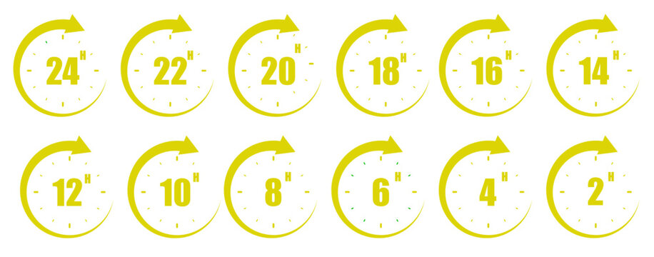set of yellow clock icons showing 2, 4, 6, 8, 10, 12, 14, 16, 18, 20, 22 and 24 hours.