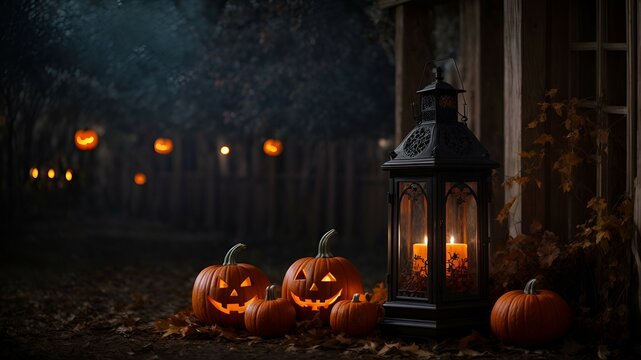 Halloween background with pumpkins and  lantern - a Halloween scene with pumpkins and a lantern at Night - Ratio 16 x 9  - Halloween background - Halloween wallpaper