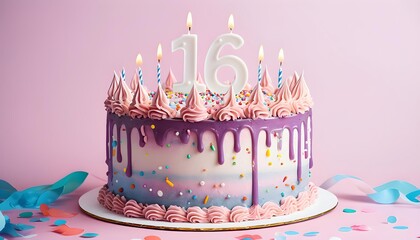 Colorful 16th birthday cake with candles and sprinkles, celebration banner, party decoration