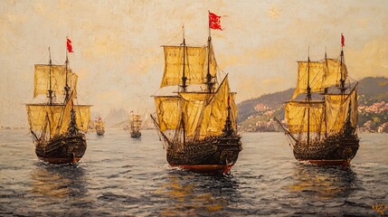 Oil painting artistic image of 16th century Venice with big ship that carry