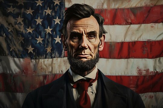Abraham Lincoln portrait in formal attire against American flag backdrop