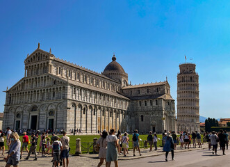 PISA, ITALY August 06, 2022 Many tourists visit the Renaissance square of Miracles with the famous leaning tower in the city of Pisa. Amazing Pisa Italy