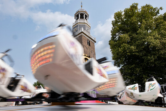 Breakdance Luxury club fairground attraction (motion blur) in front of the tower of the reformed church with its octagonal lantern in the village of Lemmer, the Netherlands, August 17 2024