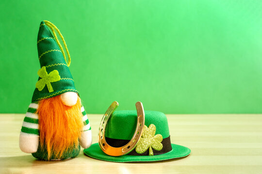 Funny gnome leprechaun, horseshoe and green hat on wooden table. Happy St Patrick´s Day.