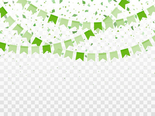 Irish holiday - happy Saint Patrick's Day background with garland flags, coins and balloons. Colorful festive bunting with clover. Vector illustration for greeting card, poster, celebration banner