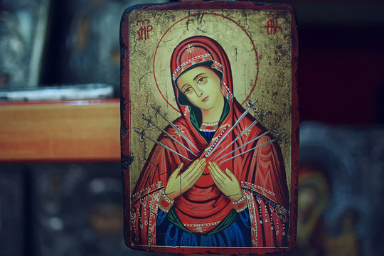 Kalambaka, Greece - September 17, 2019: Orthodox icons in a church shop, church faith concept