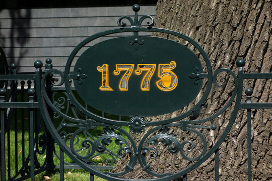 1775 year sign on metal forging fence in front of big tree. Information table placard or signboard in park or botanic garden to designate remarkable date or event