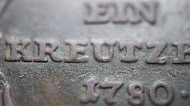 Zooming in on an old coin. Ein Kreutzer 1780 Maria Theresia, Austro Hungarian Empire. Antique copper coin