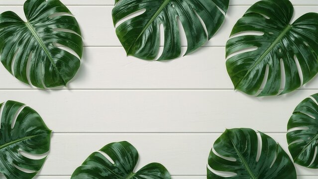 Green monstera leaves on a white wooden surface with the old image name: 1782