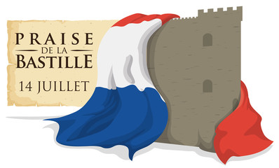 Bastille Fortress with France Flag and Scroll Remembering the Storming, Vector Illustration