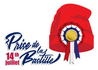 Phrygian cap or liberty cap with tricolor cockade on.  Bonnet phrygien. Prise de la Bastille 14 juillet. Bastille day 14 july. Bonne fete nationale. French National Day. Viva la France. Greeting card