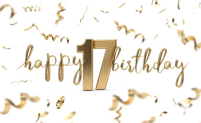 Happy birthday 17th with golden balloons and gift box on a pink background