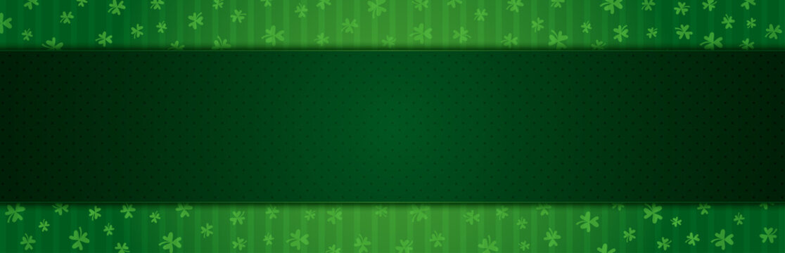 Green Patricks Day greeting banner with green clovers. Patrick's Day holiday design. Horizontal background, headers, posters, cards, website. Vector illustration