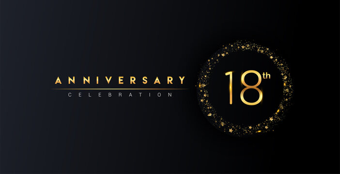 18th anniversary logo with confetti and golden glitter ring isolated on black background, vector design for greeting card and invitation card.