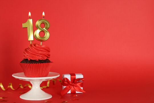 Number 18 birthday celebration candle against a bright yellow background