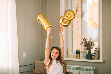 Smiling woman holding golden number 18 balloons with arms raised at home