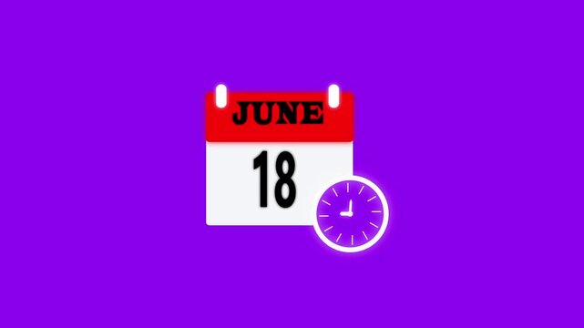 18 june month calendar with time symbol. Simple calendar icon animation and date change of time month with violet background.