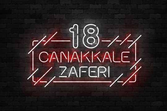 Vector realistic isolated neon sign of 18 Canakkale Zaferi logo for template decoration and layout covering on the wall background. Translation: Victory Canakkale Day in Turkey.