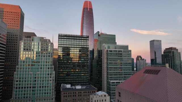 Aerial toward Salesforce tower with sunset reflection on windows and view of bay