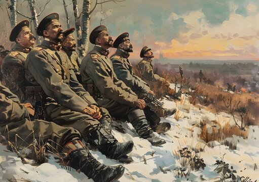 Aerial wide view of reconstruction of the battle of 1812. Soldiers fire cannons and rifles, cavalry gallops. Explosions and shots on the battlefield. Historical concept.