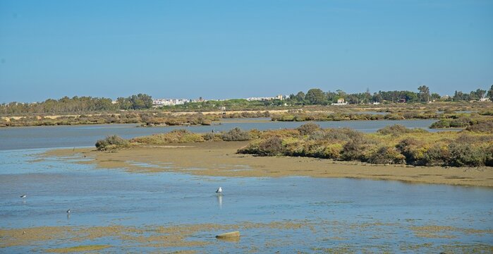 wetland landscape near Chiclana de la Frontera in Andalusia in the backround is the own of San Fernando and the Puente de la Constitución de 1812 bridge near Cadiz
