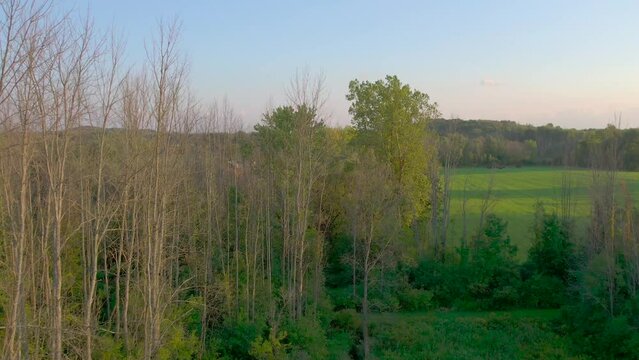 Drone aerial of the neighboring farms near the  Joseph Smith family farm, frame house, temple, visitors center, and the sacred grove in Palmyra New York Mormons and the book of Mormon.