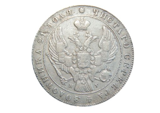 old silver Russian coin one ruble in 1841 on an isolated white background