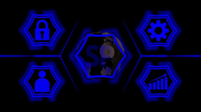 Digital Network with SP Logo and Icons for Security People Industry and Growth Keywords: SP, logo, symbol, technology, digital, network, connection, global, earth, planet, security, lock