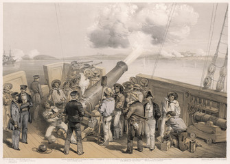 Battle of Balaclava, 25th October 1854. Charge of the Scots Greys. Crimean war. Antique illustration. 1857.