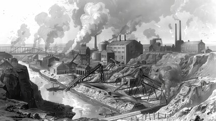 1880s steam engine era industrial factory with smokestacks producing coal fuel air pollution, industrial revolution 1.0 18th century, aerial view video footage.