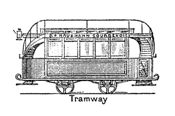 Horse-drawn tram carriage, 19th century urban rail transport, 1870s street railway vehicle, early public transit design, old vintage illustration, 1897.
