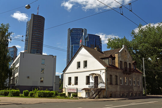 Old house dating from 1879, surrounded by modern office towers in the Snipiskes district, Vilnius, Lithuania, Europe