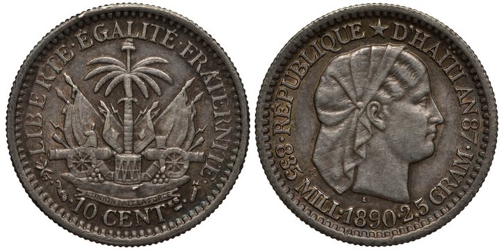 Haiti, Haitian silver coin 10 ten centimes 1890, inscriptions in French one centime, Haitian republic, palm tree with cannons and drum beneath, woman's head right