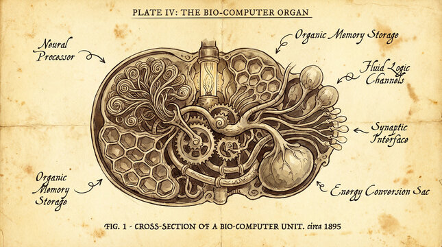 A vintage illustration of a bio-computer organ with labeled components