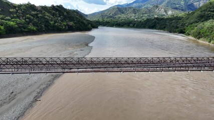 Aerial approaches Colombia's historic 1895 Puente de Occidente suspension bridge over the muddy Cauca River, panning down for a close-up of its unique wooden deck