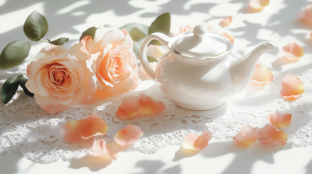 Dreamy illustration of a classic England afternoon tea, soft peach and sage washes, lace tablecloth texture