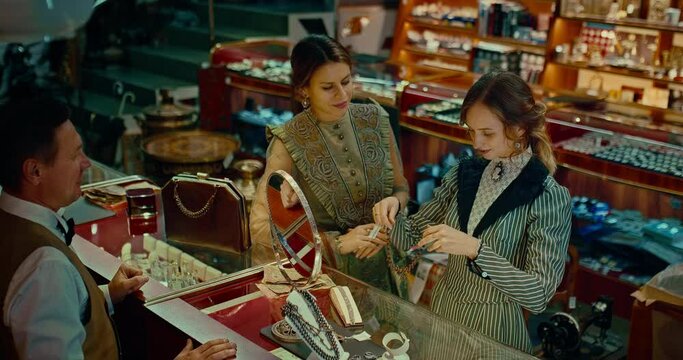 beautiful ladies friends shopping in jewelry shop in 19 century, 4K, Prores