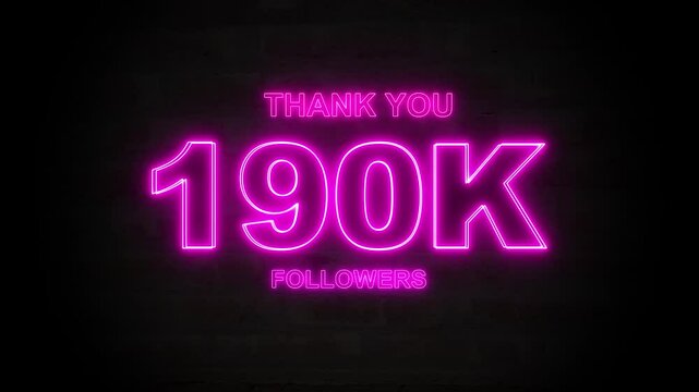 Thank you 190K followers. 190,000 followers realistic neon sign on the brick wall animation. confetti party effects, social media milestone motion graphics animation.