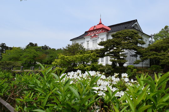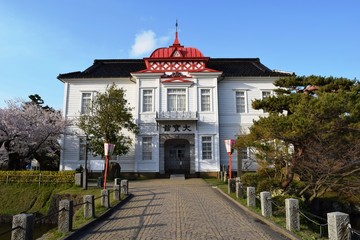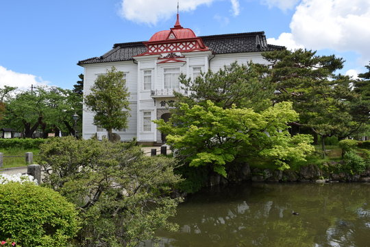 赤いドームの大宝館 / 山形県鶴岡市にある大宝館は、大正天皇の即位を記念して、大正4年(1915)に建てられた、赤いドームと白壁が特徴の、完成度の高い擬洋風建築です。開館当初は、物産陳列場、戦後は市立図書館として利用されていました。現在は、明治の文豪・高山樗牛や、日本のダ・ヴィンチといわれた松森胤保、昭和初期の日本の代表作家・横光利一など、鶴岡が生んだ先人たちの偉業を讃える資料を展示しています。